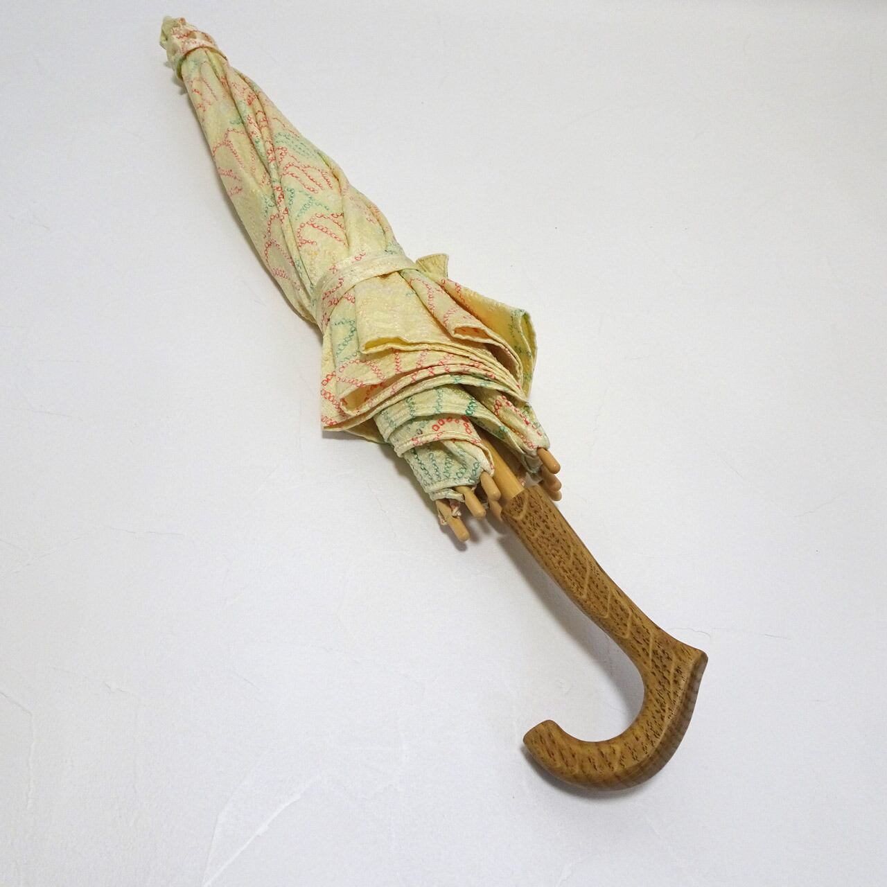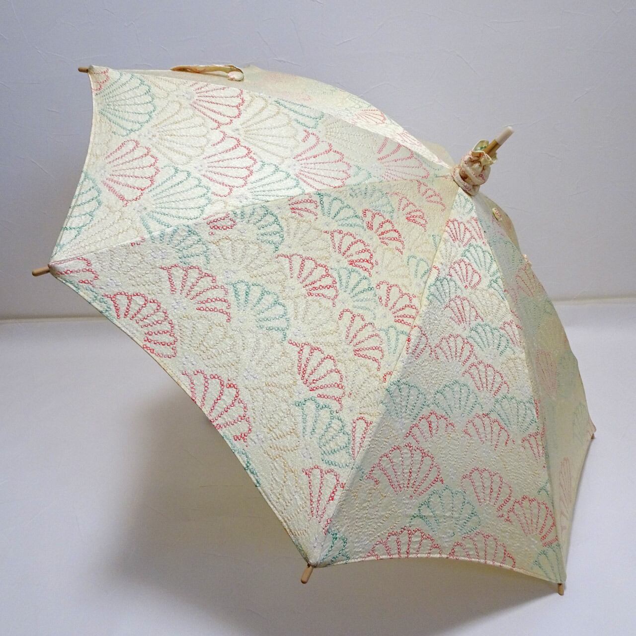 優しいはちみつ色に赤、緑、黄色の絞りの効いた日傘です。