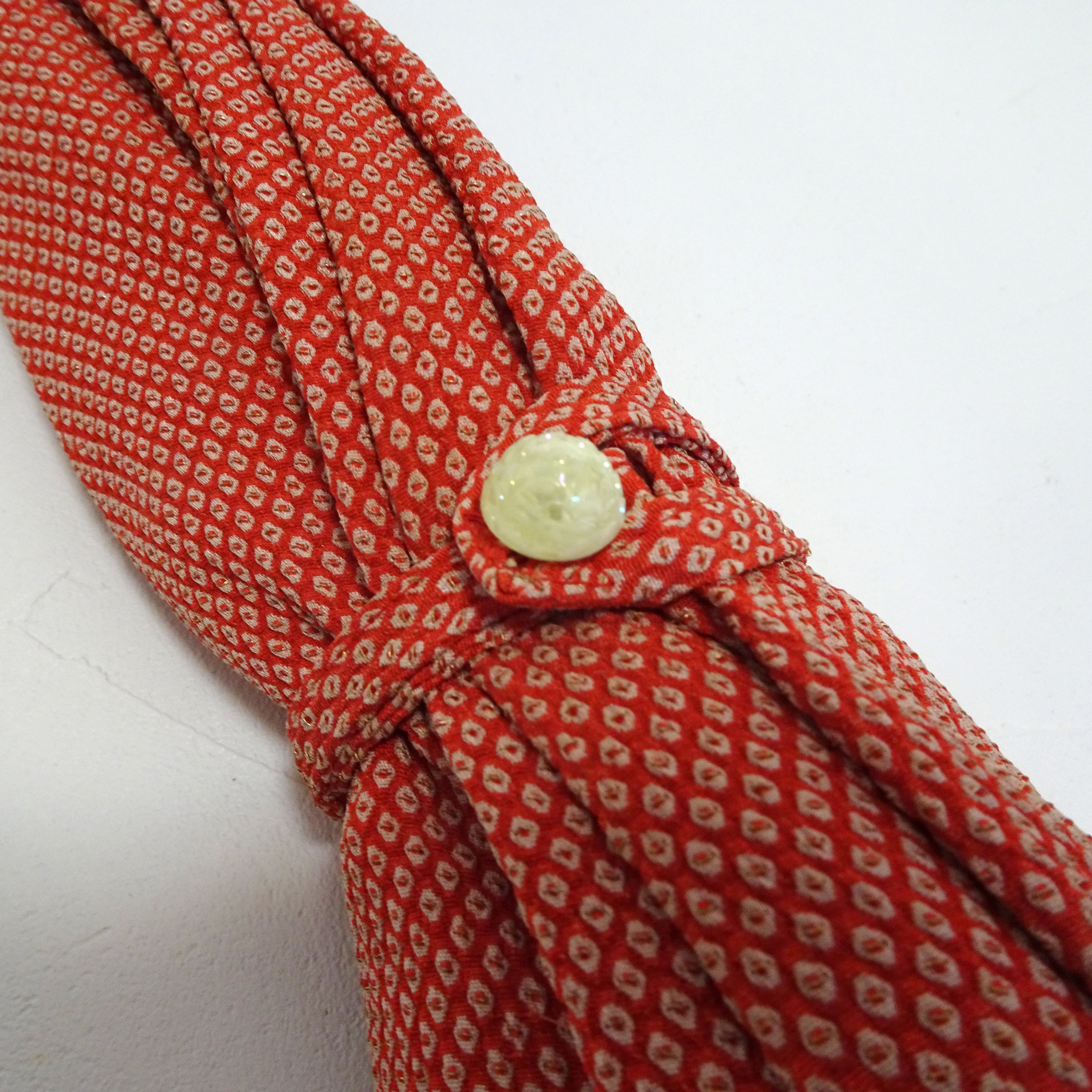 茜色が可愛らしい鹿の子絞りです。細かな手仕事が職人さんの繊細さを物語ります。